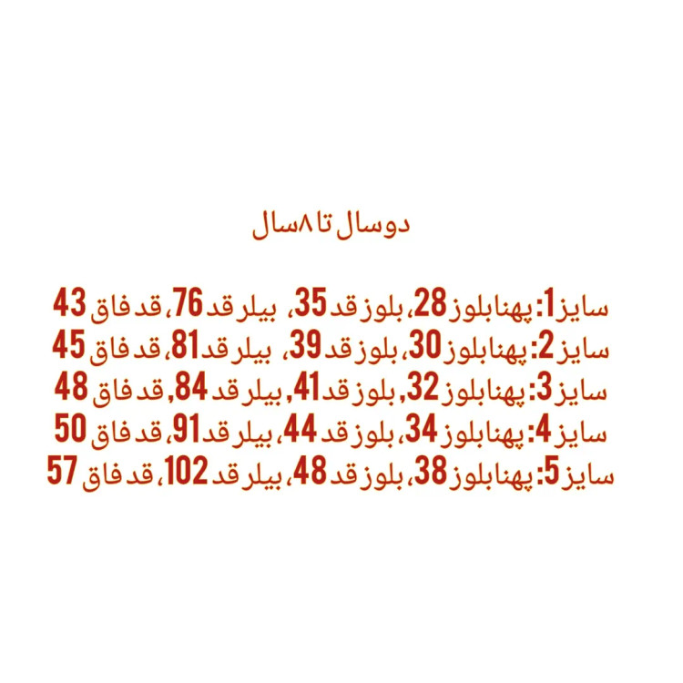 سایز 5: پهنابلوز 38، بلوز قد 48، بیلر قد 102، قد فاق 57